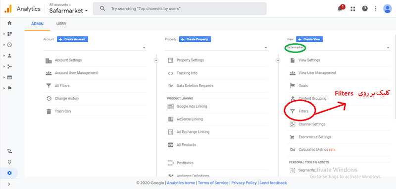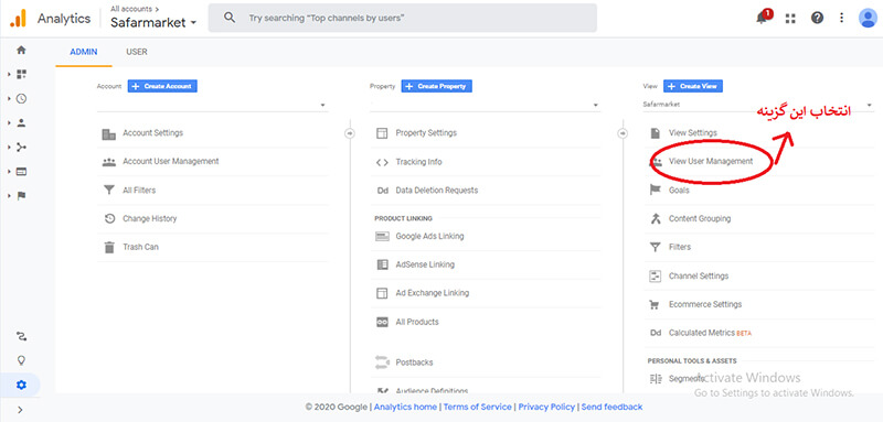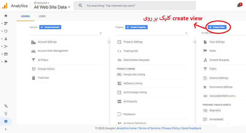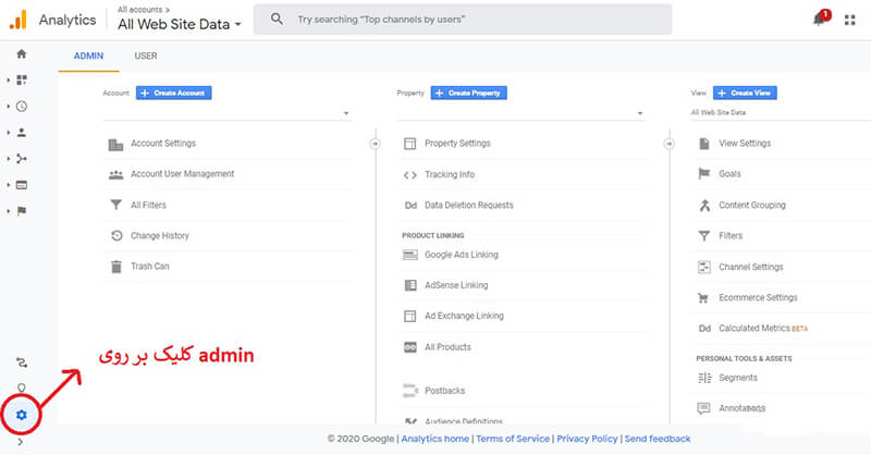 ۱- وارد حساب کاربری گوگل آنالیتیکس خود شوید و ابتدا روی گزینه admin همانند شکل زیر کلیک کنید.