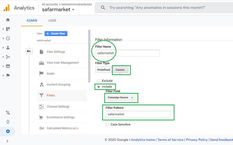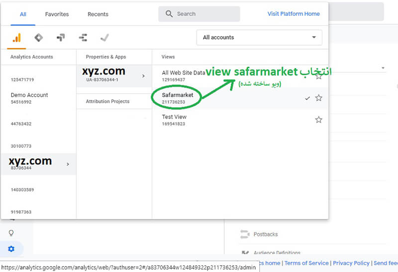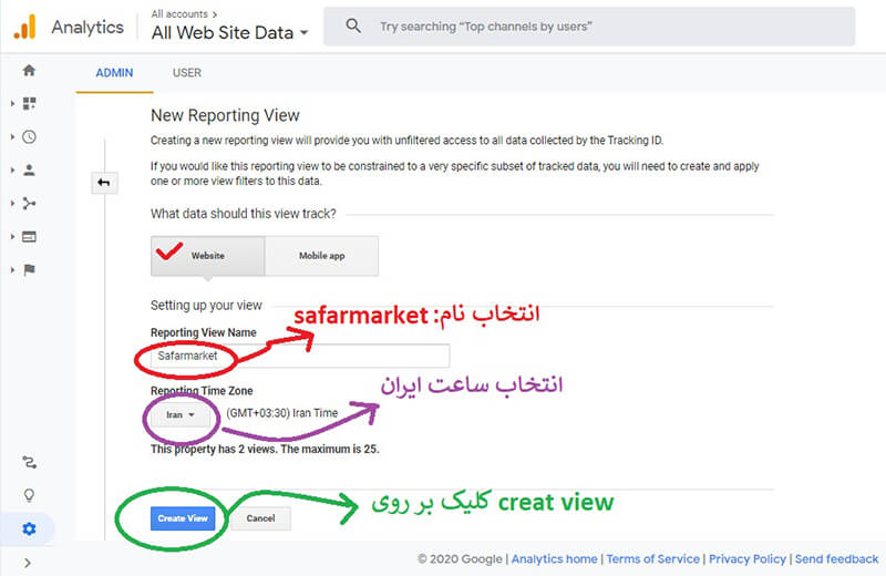 ۳- گزینه website را انتخاب و سپس Safarmarket را به عنوان مشاهدهکننده وارد کرده و زمان را به وقت محلی ایران تغییر میدهیم و سپس بر روی دکمه Create View کلیک میکنیم.