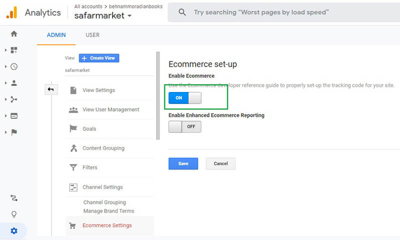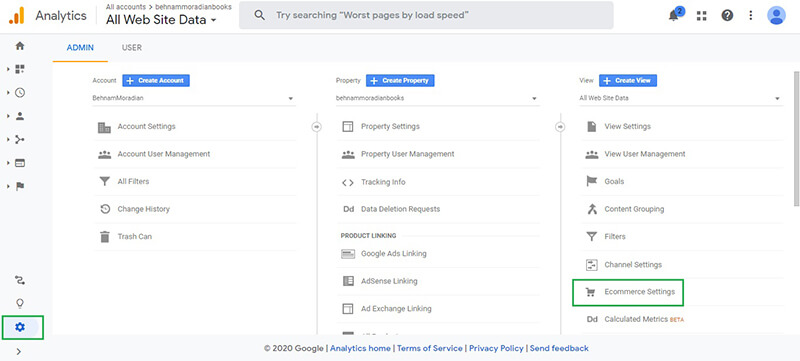 ۱- ابتدا وارد حساب گوگل آنالیتیکس خود شوید و در view مورد نظرتان، دکمه admin را بزنید تا یک پنجره جدید باز شود. در آن گزینه Ecommerce Settings را بزنید.