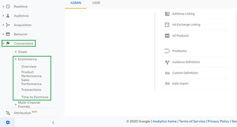 از ستون سمت چپ، گزینه conversions را باز کرده و گزینه ecommerce را انتخاب کنید. پنج نوع گزارش اصلی که در بخش های قبل توضیح دادیم (گزارش کلی، عملکرد محصول، عملکرد فروش، داد و ستدها و بازه زمان فروش) را میتوانید ببینید.