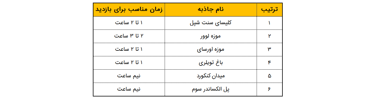 در روز دوم برنامه سفر به پاریس میخواهیم در پیرامون ساحل رود سن بگردیم و از جاهای دیدنی پاریس که در کنار این رود پدید آمدهاند بازدید کنیم. از آنجایی که جاهای دیدنی تاریخی پاریس معمولا تا حوالی ساعت ۶ عصر دایر هستند، بازدید از این مکانها را در بخش اول برنامه امروز قرار دادیم تا هیچکدام از آنها را از دست ندهیم. در بخش پایانی روز میتوانید با خیال راحت از مکانهای عمومی مانند میدان کنکورد و پل الکساندر سوم لذت ببرید. به ویژه اینکه این مکانها در شبها و با نورپردازیهای مخصوصی که دارند، زیباتر هم هستند. روی رود سن چندین پل وجود دارد. برای بازدید از جاذبههای امروز باید از روی چند تا از این پلهای زیبا چند بار عبور کنید که خود بخشی از بازدید شما خواهد بود.