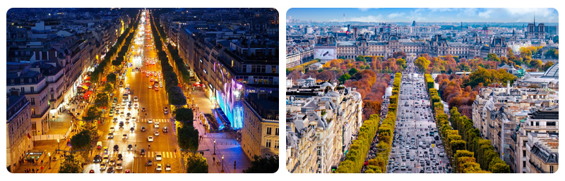حرکتمان به سمت جنوب را ادامه میدهیم تا به شرقیترین نقطه خیابان شانزه لیزه، مهمترین نام در بین خیابان های دیدنی پاریس برسیم. خیابان شانزه لیزه (Champs-Élysées) مشهورترین خیابان و بلوار پاریس و شاید کل اروپا باشد. شانزه لیزه نماد مد و زیباییهای پاریسی است و به همین دلیل، حتی خیابانی در تهران که راسته فروش پوشاک است هم به نام شانزه لیزه نامگذاری شده است. شانزه لیزه بلواری تقریبا ۲ کیلومتری است که میدان کنکورد را به میدان شارل دو گل و یادبود مشهور تاق پیروزی میرساند. رژه نیروهای نازی در زمان اشغال فرانسه در جنگ جهانی دوم و سپس حرکت نیروهای آمریکایی در زمان آزادسازی فرانسه در سال ۱۹۴۴، از جمله رویدادهای تاریخی است که در این خیابان به ثبت رسیده است.