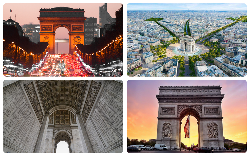 در پاریس دو تاق پیروزی (Arc de Triomphe) قرار دارد که رو به روی هم در دو سوی شانزه لیزه قرار گرفتهاند و ساختشان همزمان با یکدیگر و در زمان ناپلئون بناپارت آغاز شده است. یکی (Arc de Triomphe du Carrousel) در کنار موزه لوور قرار دارد و دیگری (Arc de Triomphe de l'Étoile) در میدان شارل دو گل. تاق پیروزی میدان شارل دو گل اما از نظر اندازه دو برابر بزرگتر است و ساخت آن تا سال ۱۸۳۶ به درازا کشیده است. این تاق پیروزی به یاد کشتهشدگان فرانسوی در انقلاب فرانسه و جنگهای ناپلئونی ساخته شده است. همچنین یک شعله آتش به یادبود کشتهشدگان گمنام فرانسه در جنگ جهانی اول در زیر این تاق قرار دارد.